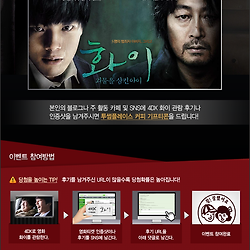 네영카와 함께 하는 관람 인증 이벤트 4DX로 화이를 재미있게 관람하신후, 영화티켓 인증샷이나 후기를 SNS에 올리고, 해당 URL을 아래 댓글로 남겨주세요. 추첨을 통해서 30분께 투썸플레이스 커피 기프티콘을 드립니다! 인증샷 올리실때 4DX 확인이 가능하도록 인증샷 잘 쩍어 올려주세요. 응모기간 10월 10일부터 20일까지 (10일간)당첨발표 10/21 네이버 영화 카테고리 1위순수 영화 커뮤니티 전문 카페네이버 영화 카페 화이 4DX 관람 인증 참여하기