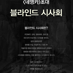 블라인드 시사회 블라인드 시사회는 주연배우, 감독, 영화 제목, 장르 등 모든 것을 사전에 밝히지 않고 상영하는 비공개 시사회입니다. 영화를 수입하거나 제작 후 일반 시사회 및 정식 개봉 전 영화의 반응을 보기 위해서 진행하는 시사회입니다. 블라인드 시사회에서도 편집본과 완성본이 존재하기는 하지만 결과적으로는 반응을 알아보기 위함이기 때문에 상영 전과 상영 후에 작성하는 설문지가 제공됩니다. 블라인드 모니터 시사회 초대 정보 초대제한 제한 없음시사장소 대한 극장시사일시 2013/10/17(목) 오후 8시시사인원 80명 (1인 2매 총 160매) 당첨발표 10/15(화) 네이버 영화 카테고리 1위순수 영화 커뮤니티 전문 카페네이버 영화 카페 네영카 블라인드 모니터링 시사회 참여하기